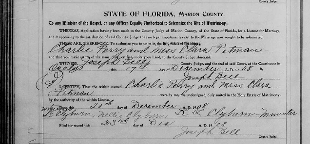 CHARLIE HENRY PERRY AND CLARA PITTMAN MARRIAGE CERTIFICATE
